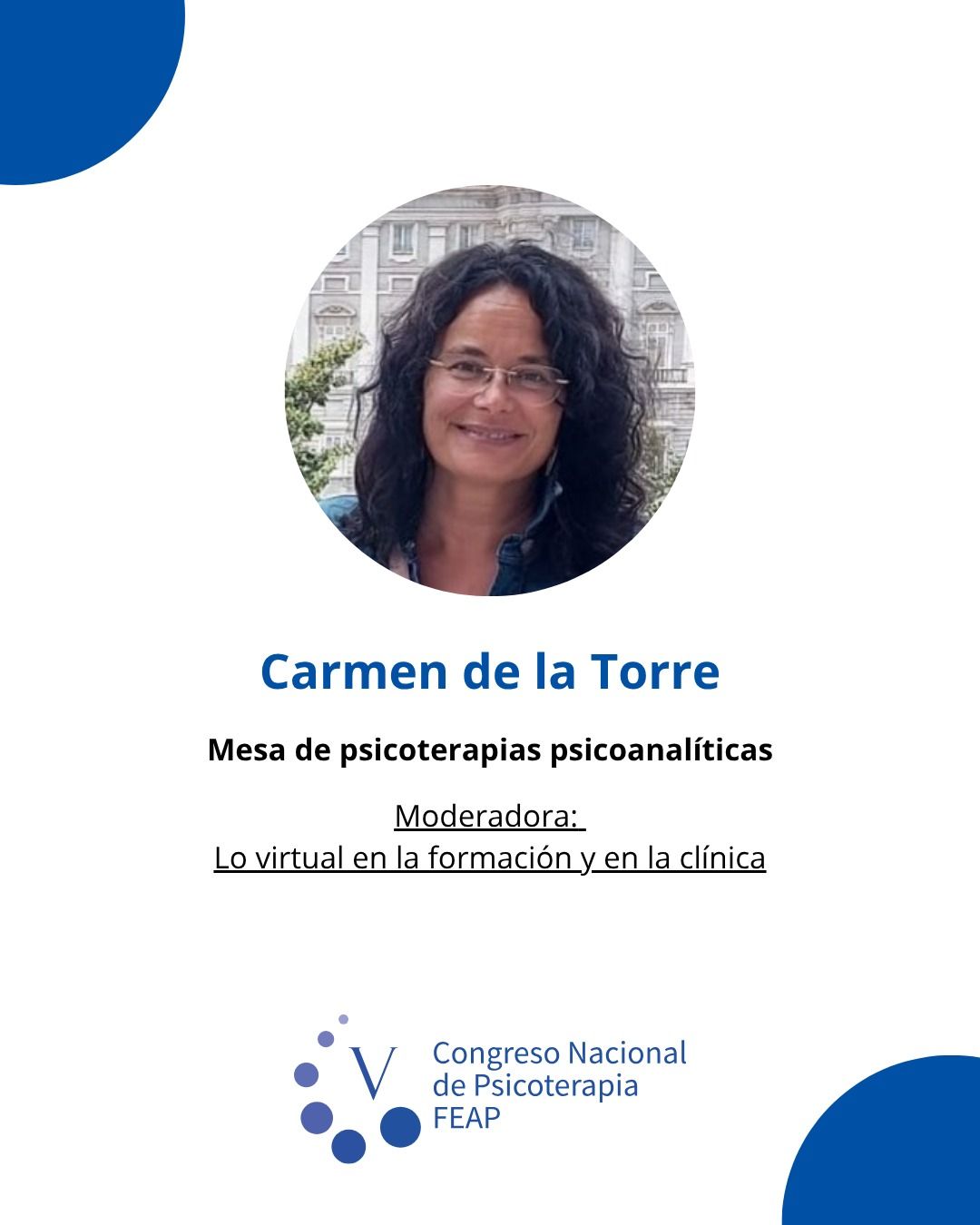 📢 Carmen de la Torre será moderadora en la mesa de psicoterapias psicoanalíticas. Se titula "Lo virtual en la formación y en la clínica" Esta mesa tendrá lugar en nuestro V Congreso Nacional de Psicoterapia. 📍 Zaragoza del 13 al 15 de noviembre de 2025. Puedes inscribirte a nuestro congreso en este enlace: 💁‍♂️https://feapzaragoza.com/inscripciones/ ℹ️Más información sobre Carmen: https://feapzaragoza.com/personas/carmen-de-la-torre/ #congreso #congresofeap #congresopsicoterapia #saludmental #mesas #psicoterapias #psicoanalitica