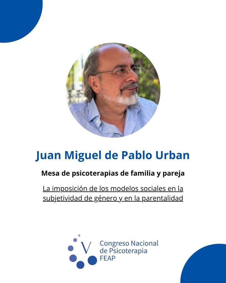📢 Juan Miguel de Pablo Urban será ponente en la mesa de psicoterapias de familia y pareja, en la que también participarán María José Durán y Virginia Cagigal de Gregorio. Su ponencia se titula "La imposición de los modelos sociales en la subjetividad de género y en la parentalidad" Esta mesa tendrá lugar en nuestro V Congreso Nacional de Psicoterapia. 📍 Zaragoza del 13 al 15 de noviembre de 2025. Puedes inscribirte a nuestro congreso en este enlace: 💁‍♂️ https://feapzaragoza.com/inscripciones/ ℹ️Más información sobre el ponente: https://feapzaragoza.com/personas/juan-miguel-de-pablo-urban/ #congreso #congresofeap #congresopsicoterapia #saludmental #mesas #psicoterapias #familiaypareja